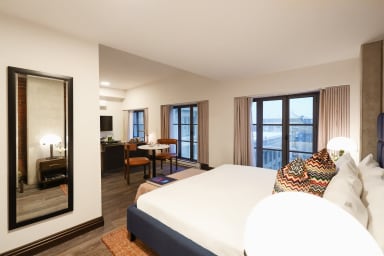 A shared rooftop terrace, accessible seasonally, offers open views over Old Montreal.