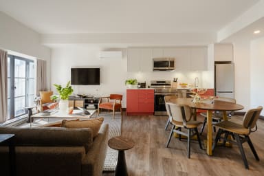 A shared rooftop terrace, accessible seasonally, offers open views over Old Montreal.