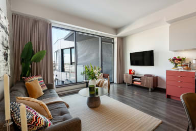 A thoughtfully designed studio overlooking a quiet courtyard, featuring a private balcony.