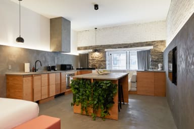 Découvrez un espace où le charme du Vieux-Montréal rencontre le confort moderne. Profitez d’un lit king-size, d’une laveuse-sécheuse, d’une cuisine toute équipée, dotée d'un grand îlot et une machine Nespresso. Détendez-vous dans un coin salon, avec deux TV connectées et Netflix inclus. Accédez facilement à votre séjour grâce à l’auto-enregistrement et à votre Boarding Pass exclusif. En cadeau, repartez avec un sac tote David Hotel, un souvenir unique de votre expérience.