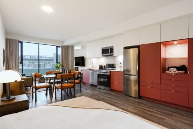 Une terrasse commune sur le toit, accessible selon la saison, offre une vue dégagée sur le Vieux-Montréal.