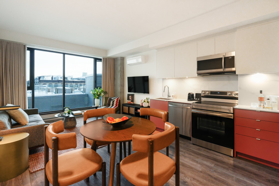 Une terrasse commune sur le toit, accessible selon la saison, offre une vue dégagée sur le Vieux-Montréal.